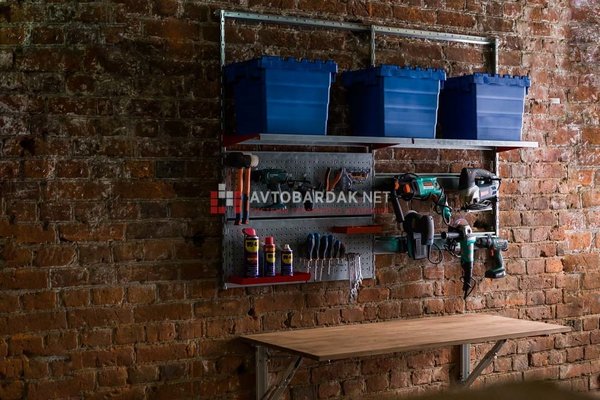 Под полками 2 перфорированные панели 800х290 мм для подвеса небольших инструментов и 2 съемных рейлинга для подвеса крюков для хранения электроинструментов.