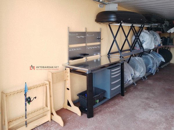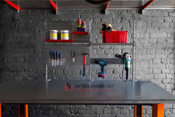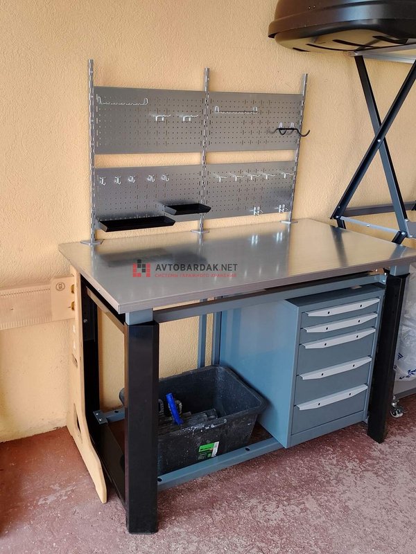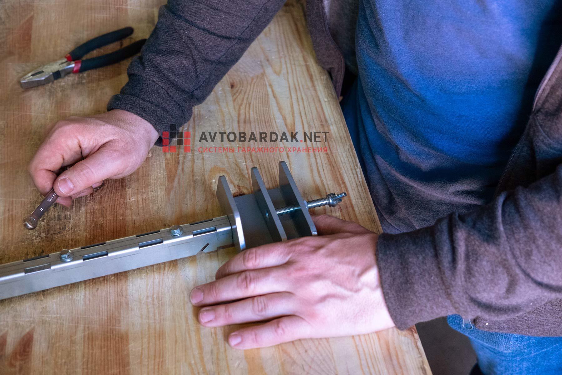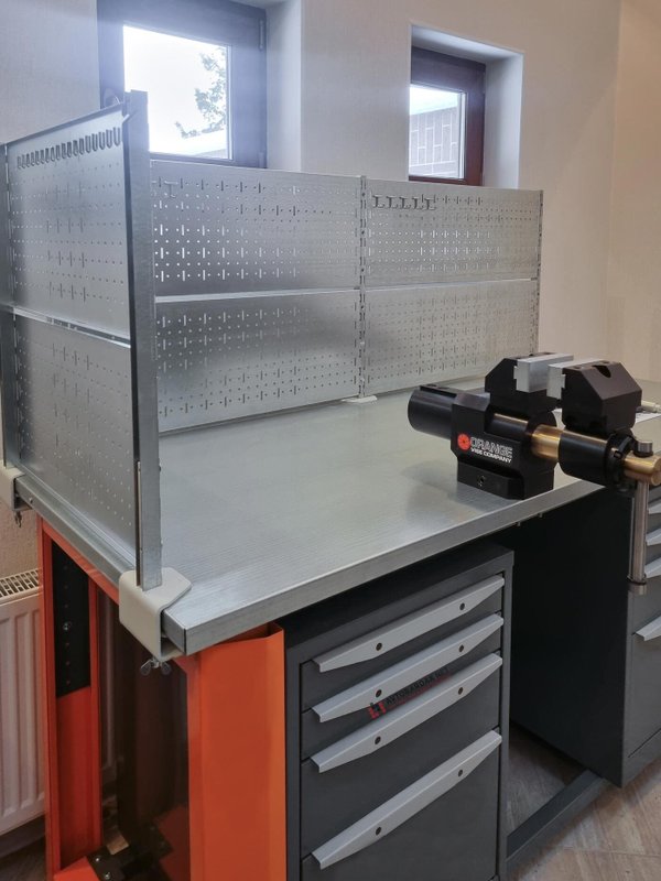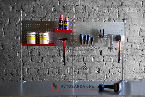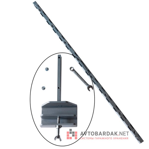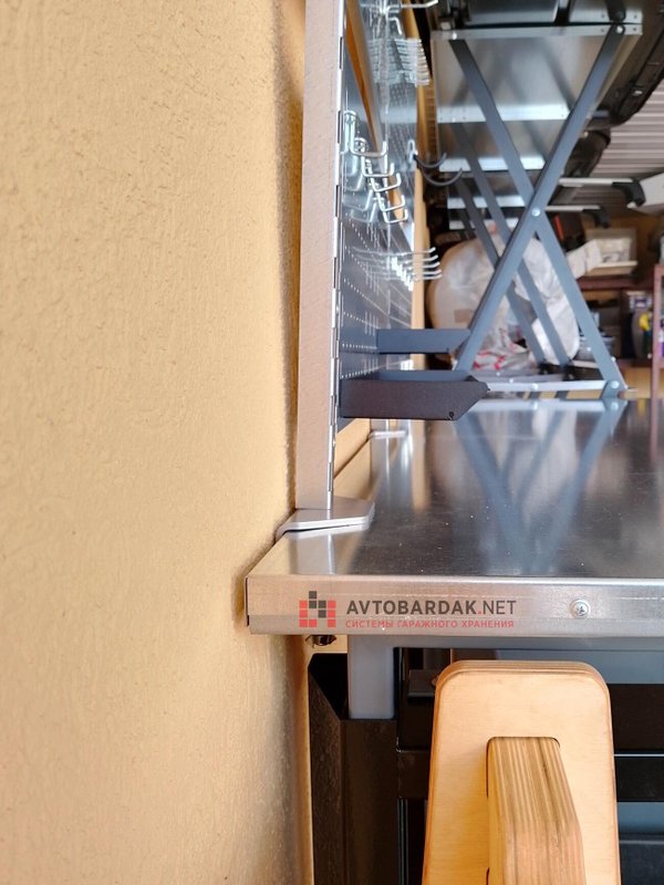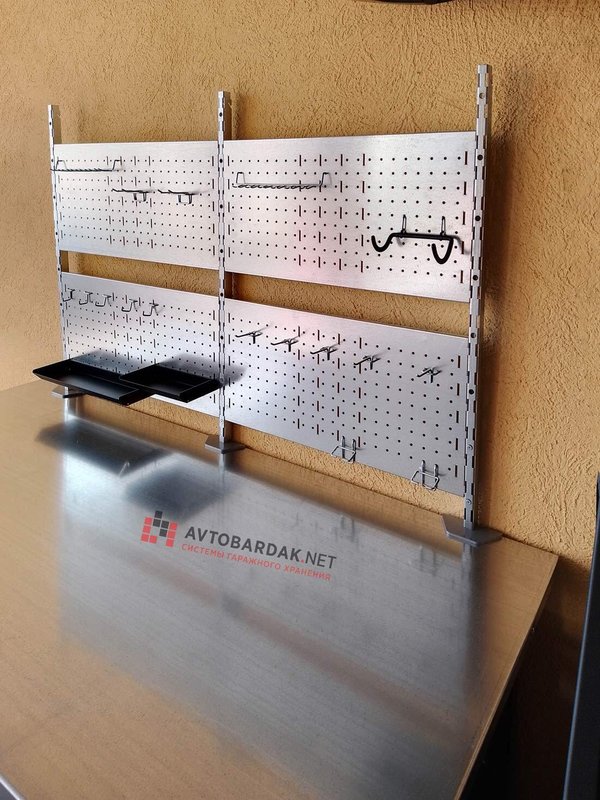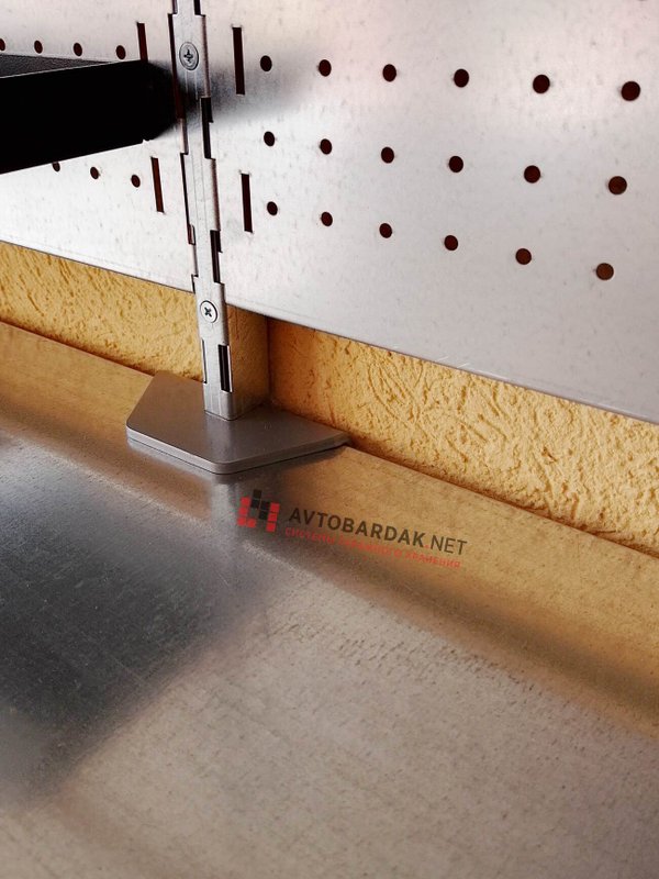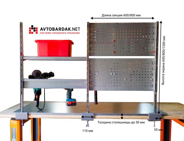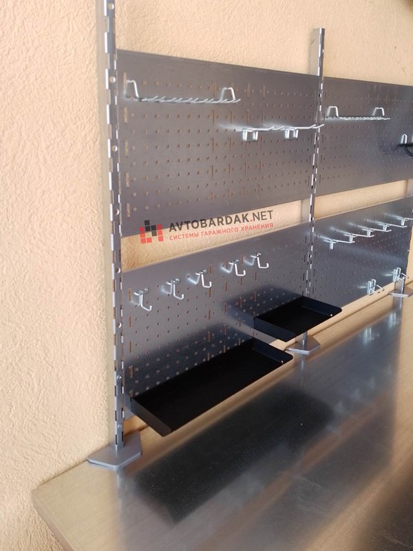 К струбцине 2 болтами М5 крепится вертикальная направляющая, на которую навешиваем панели и рейлинги для хранения инструментов. Более подробное описание (характеристики, варианты экранов для верстака, размеры, монтаж) надстольной системы хранения вы найдете по ссылке.