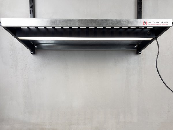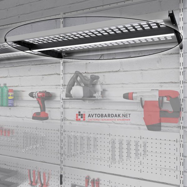 Съемные светодиодные светильники устанавливаются под металлические полки нашей настенной системы хранения IF - подходят для любых полок: перфорированных, цельнометаллических и (с помощью специальных переходников) для деревянных.