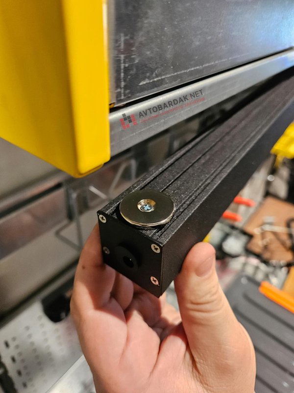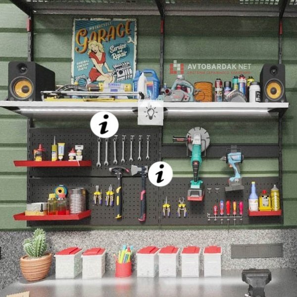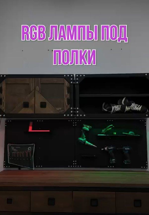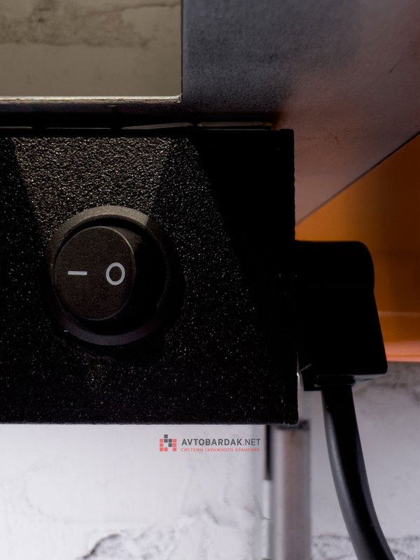 Как правило, их используют для освещения рабочей поверхности стационарного или откидного верстака (смотрите раздел мебель для гаража) под самой нижней полкой, но не только: в нескольких проектах использовали светильники для освещения всего помещения. Светильники переставляются по внутренней поверхности полки – крепятся магнитами. Их легко снимать, переставлять: все провода на разъемах, достаточно просто вытащить штекер. На каждом светильнике выключатель.