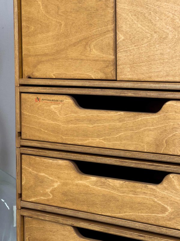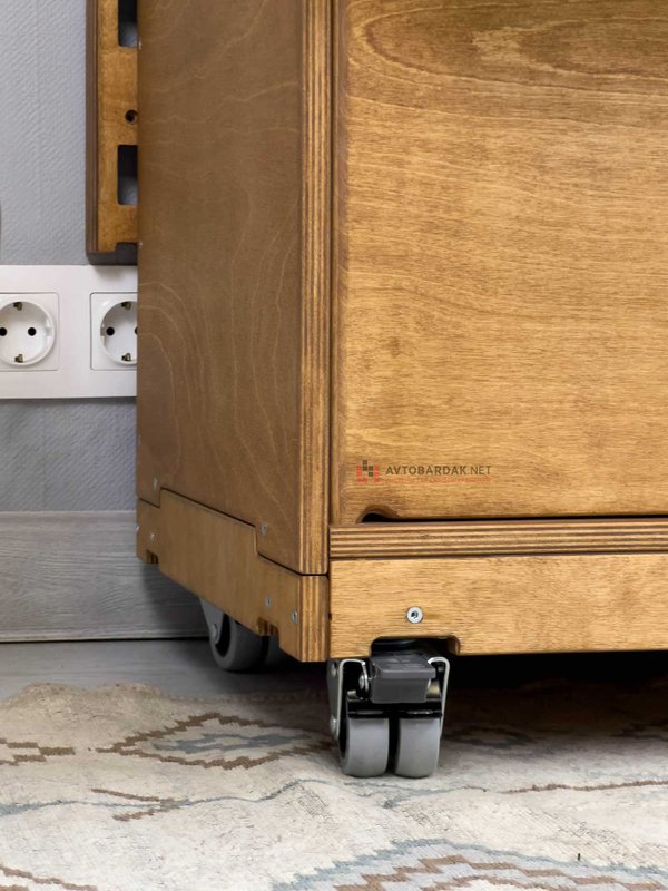 Низ модульной тумбы комплектуется подкатной тележкой на 4 колесиках (два с тормозом, два без тормоза). Тележка фиксируется с ящиками по такому же принципу. На тележке выступы, на ящиках пазы. При необходимости деревянную тележку скрепляем с нижним ящиком болтами.