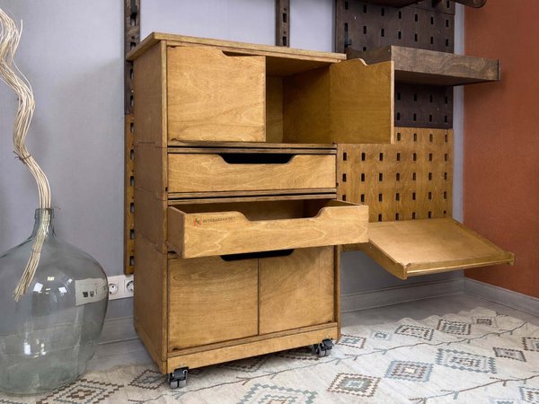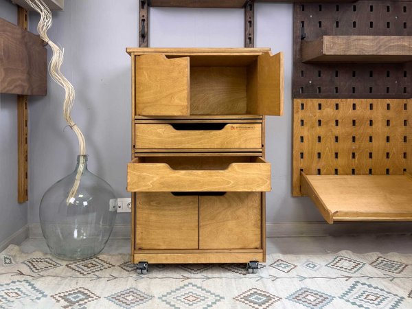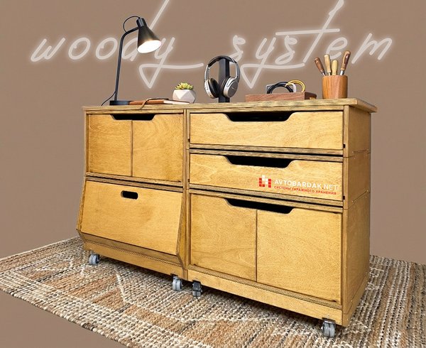 Деревянные тележки и тумбы легко перемещаются по помещению, благодаря чему пол легко мыть. Преимущество данной системы в ее модульности. Тумбы легко трансформировать, менять ящики местами, наращивать в вверх и вбок.