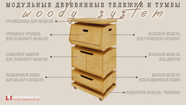 Подробное описание ящиков и модулей (материалы, нагрузка, размеры, вес, габариты и тд) в товарных карточках в каталоге "Модульные деревянные тележки и тумбы".