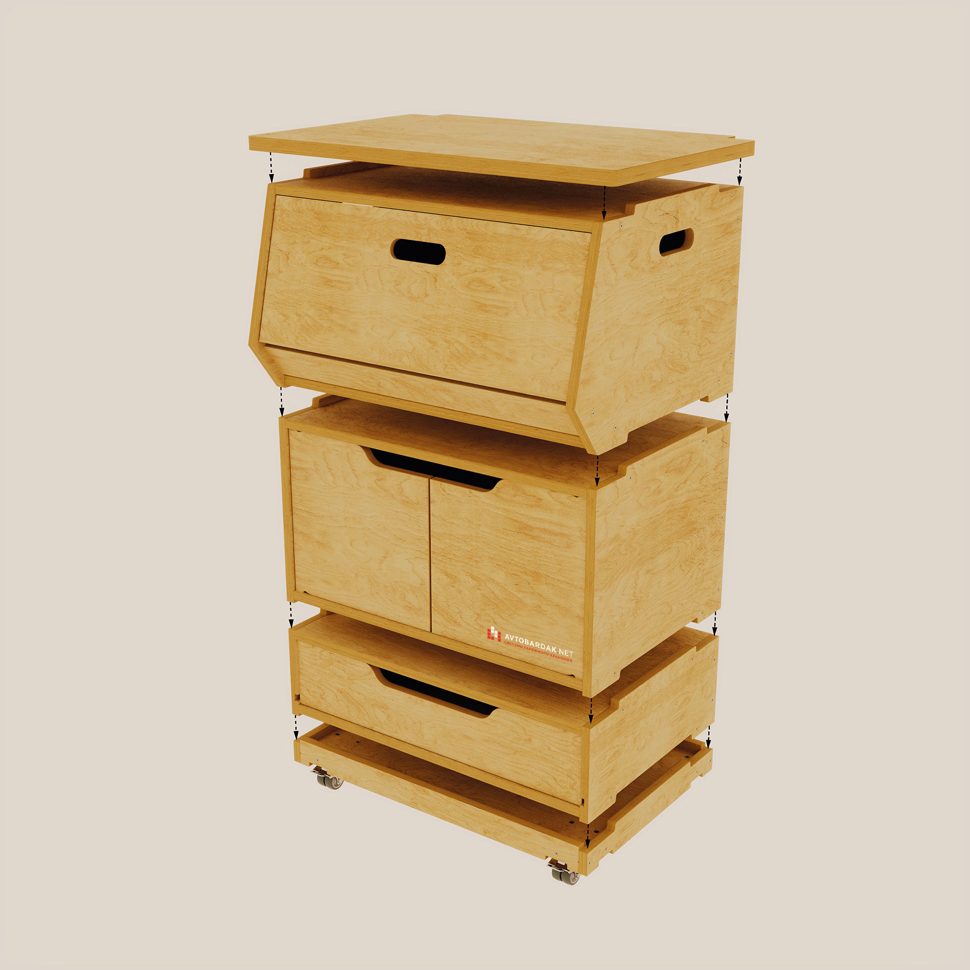 Низ модульной тумбы комплектуется подкатной тележкой на 4 колесиках (два с тормозом, два без тормоза). Тележка фиксируется с ящиками по такому же принципу. На тележке выступы, на ящиках пазы. При необходимости деревянную тележку скрепляем с нижним ящиком болтами.