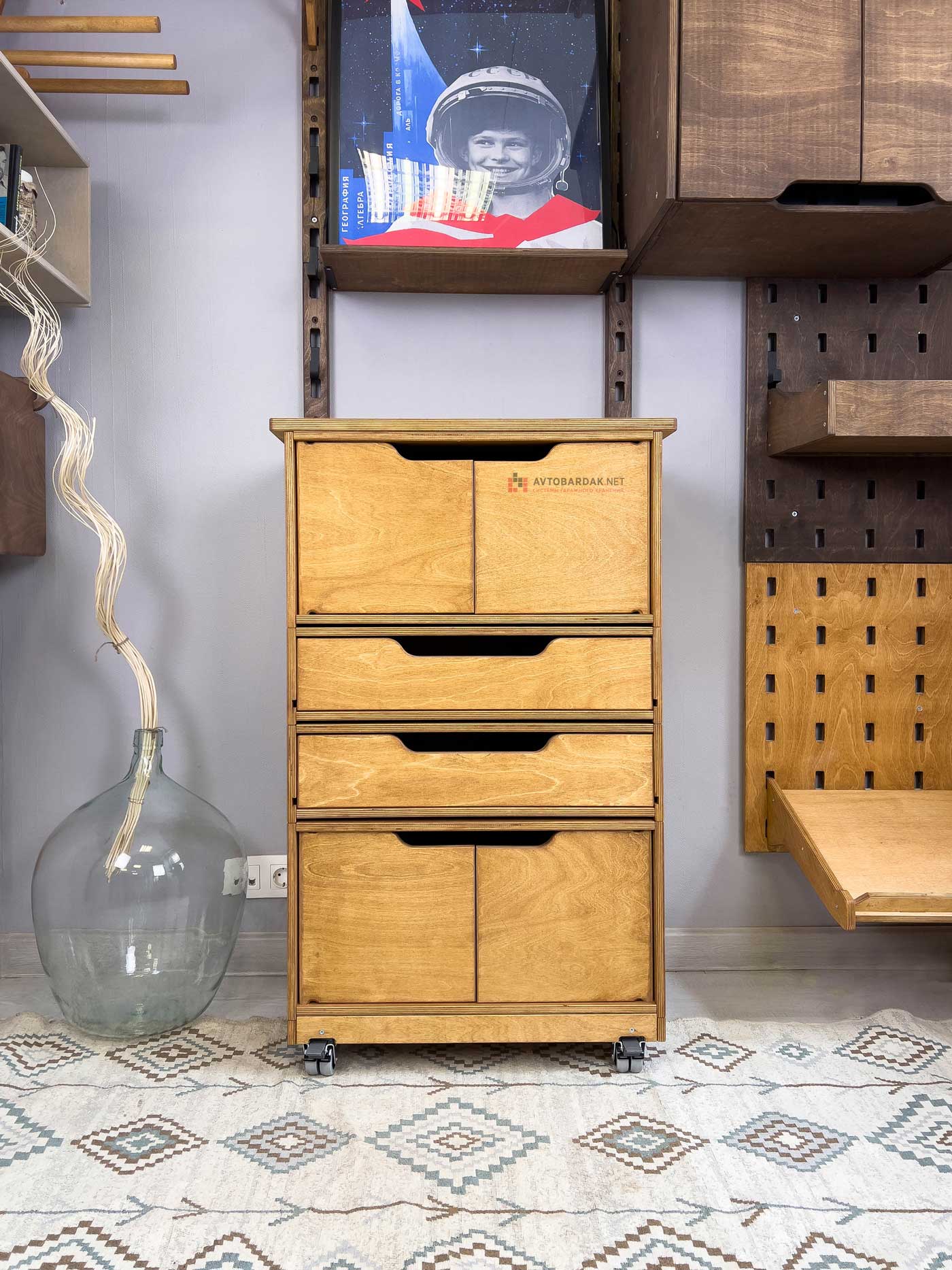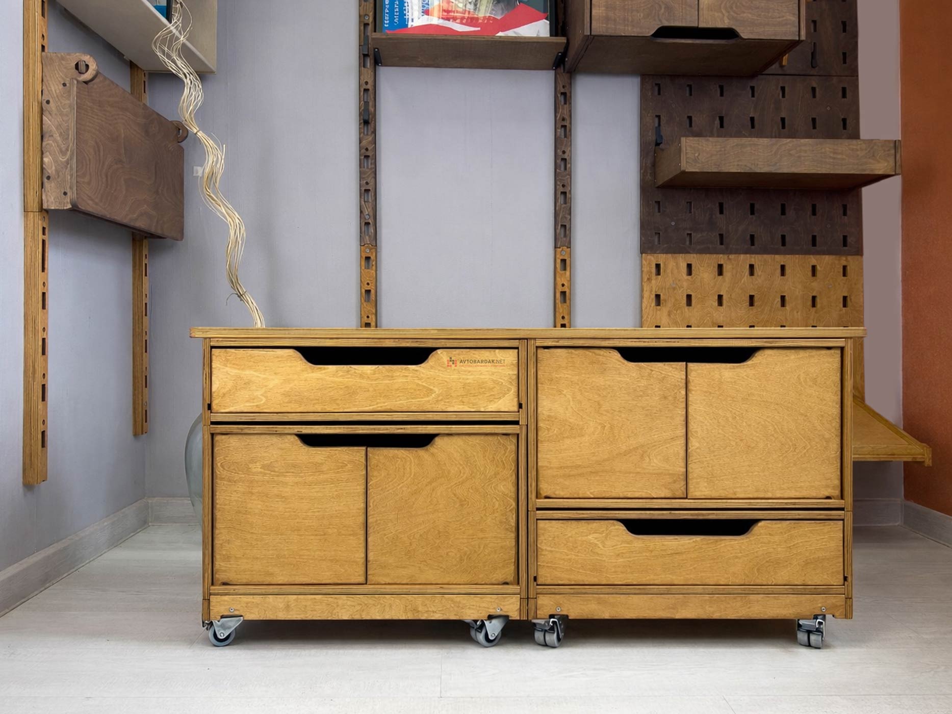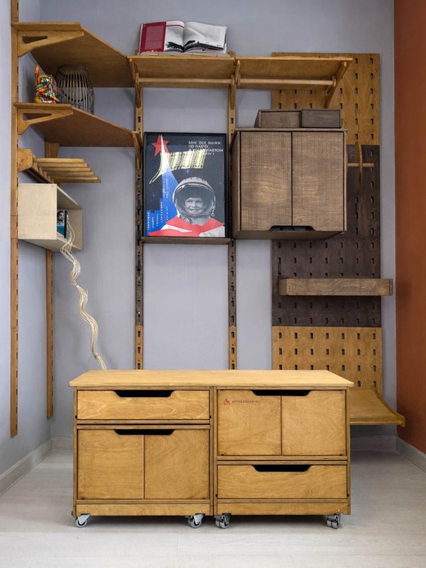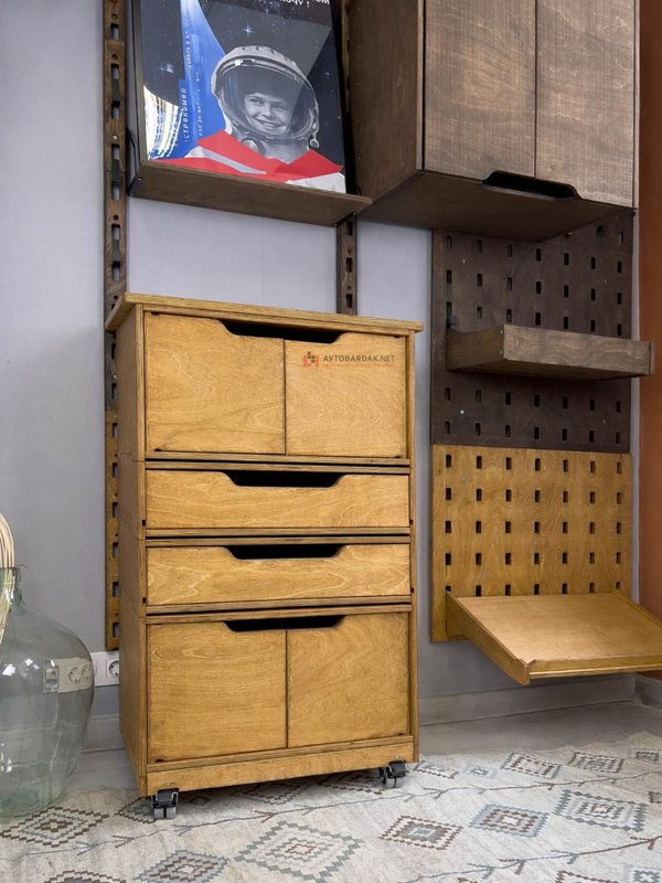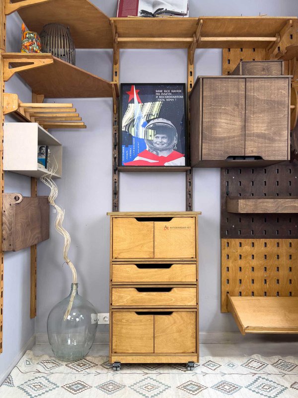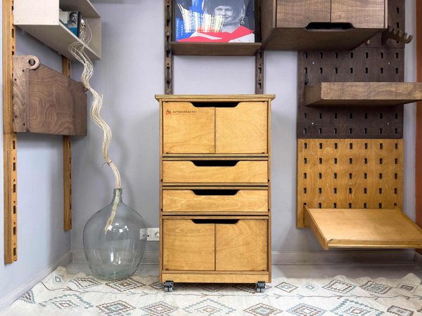 Деревянные тележки и тумбы легко перемещаются по помещению, благодаря чему пол легко мыть. Преимущество данной системы в ее модульности. Тумбы легко трансформировать, менять ящики местами, наращивать в вверх и вбок.