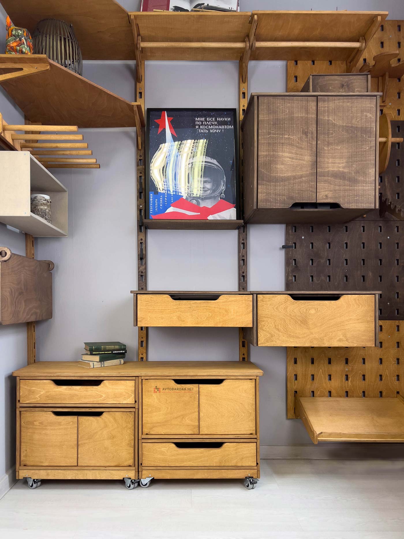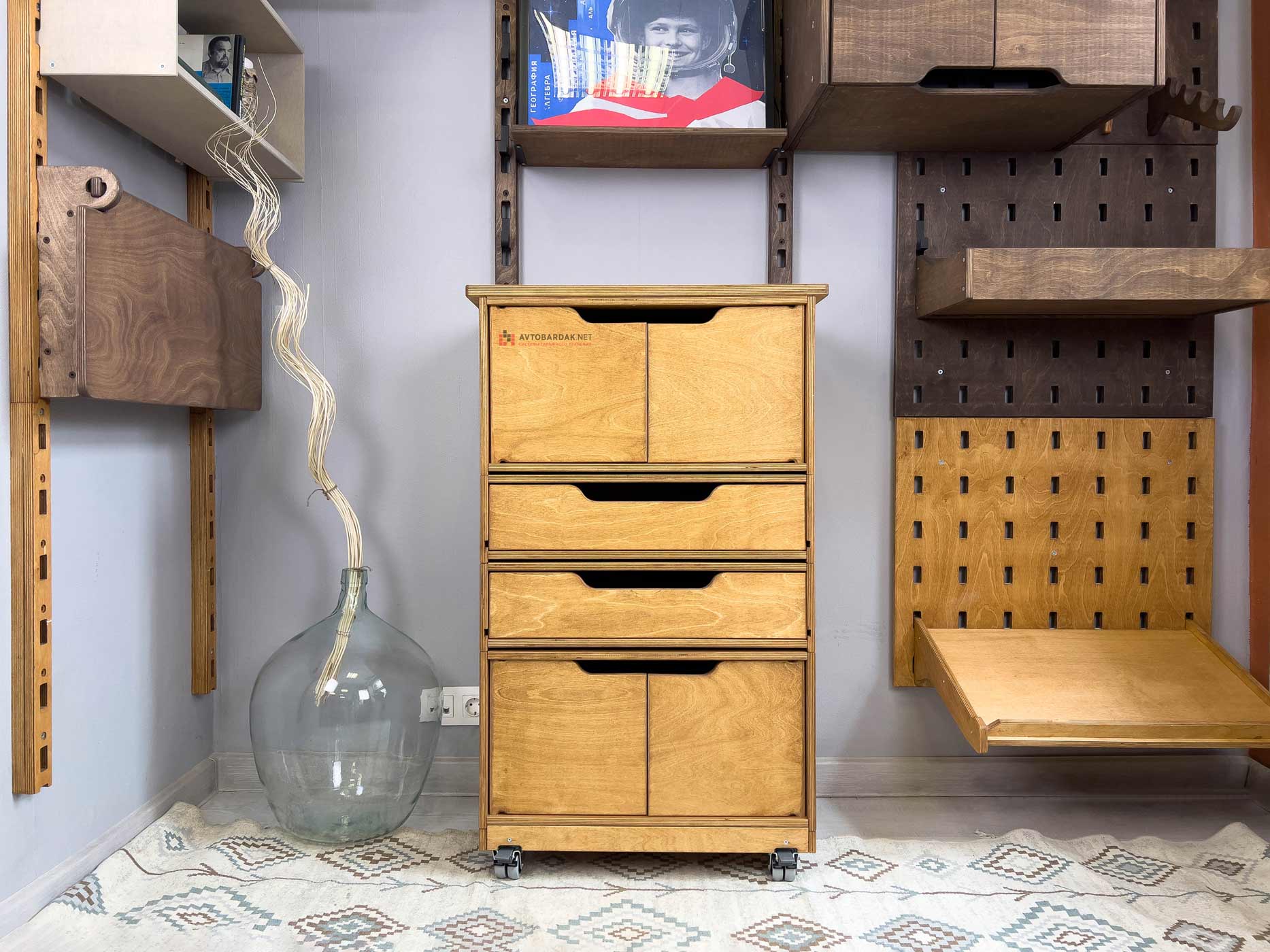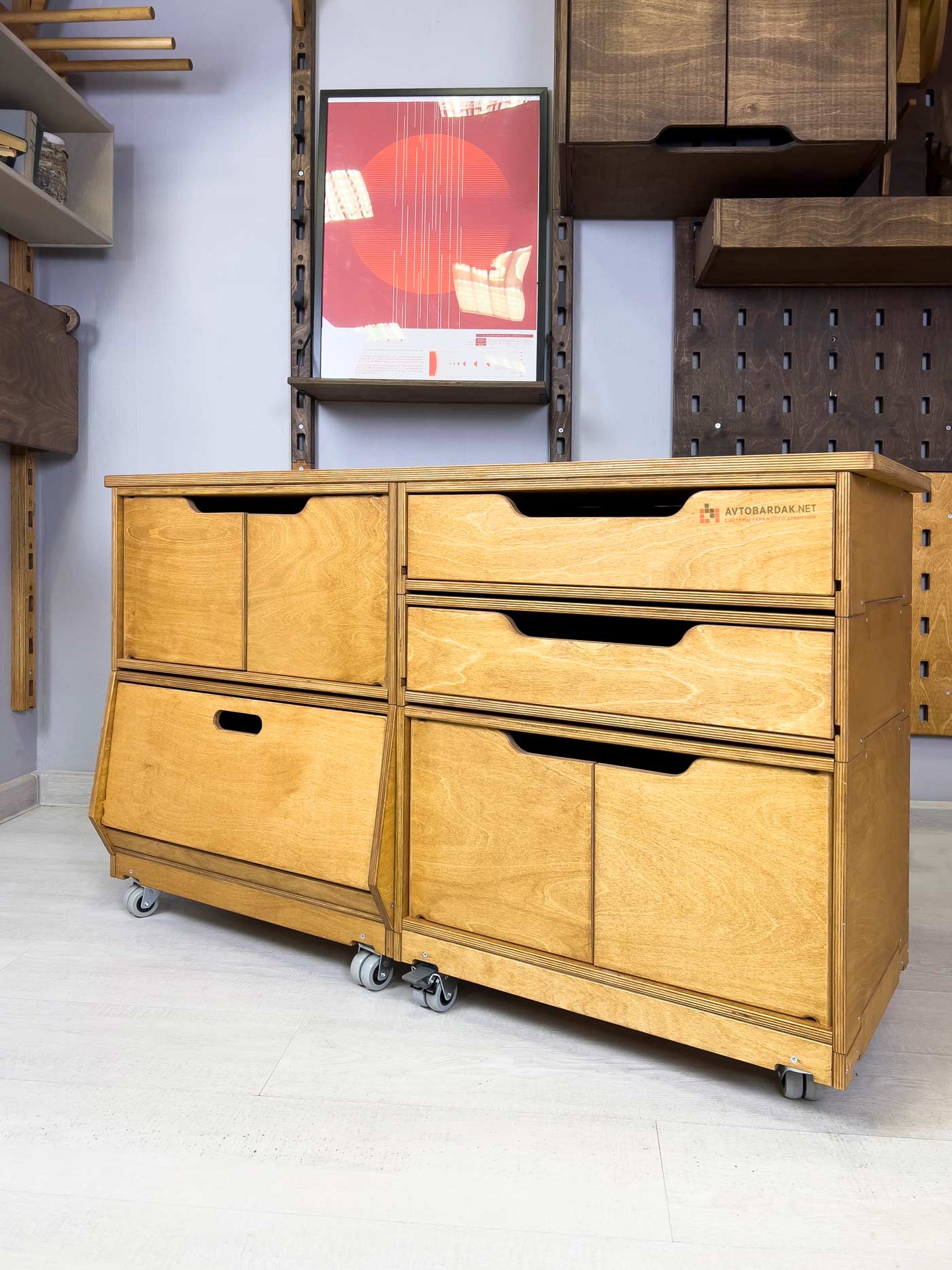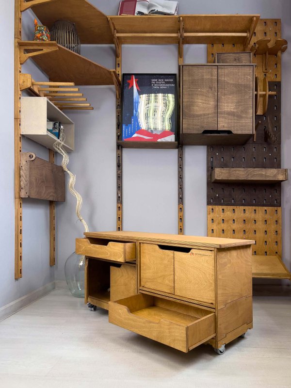 Деревянные тележки и тумбы легко перемещаются по помещению, благодаря чему пол легко мыть. Преимущество данной системы в ее модульности. Тумбы легко трансформировать, менять ящики местами, наращивать в вверх и вбок.