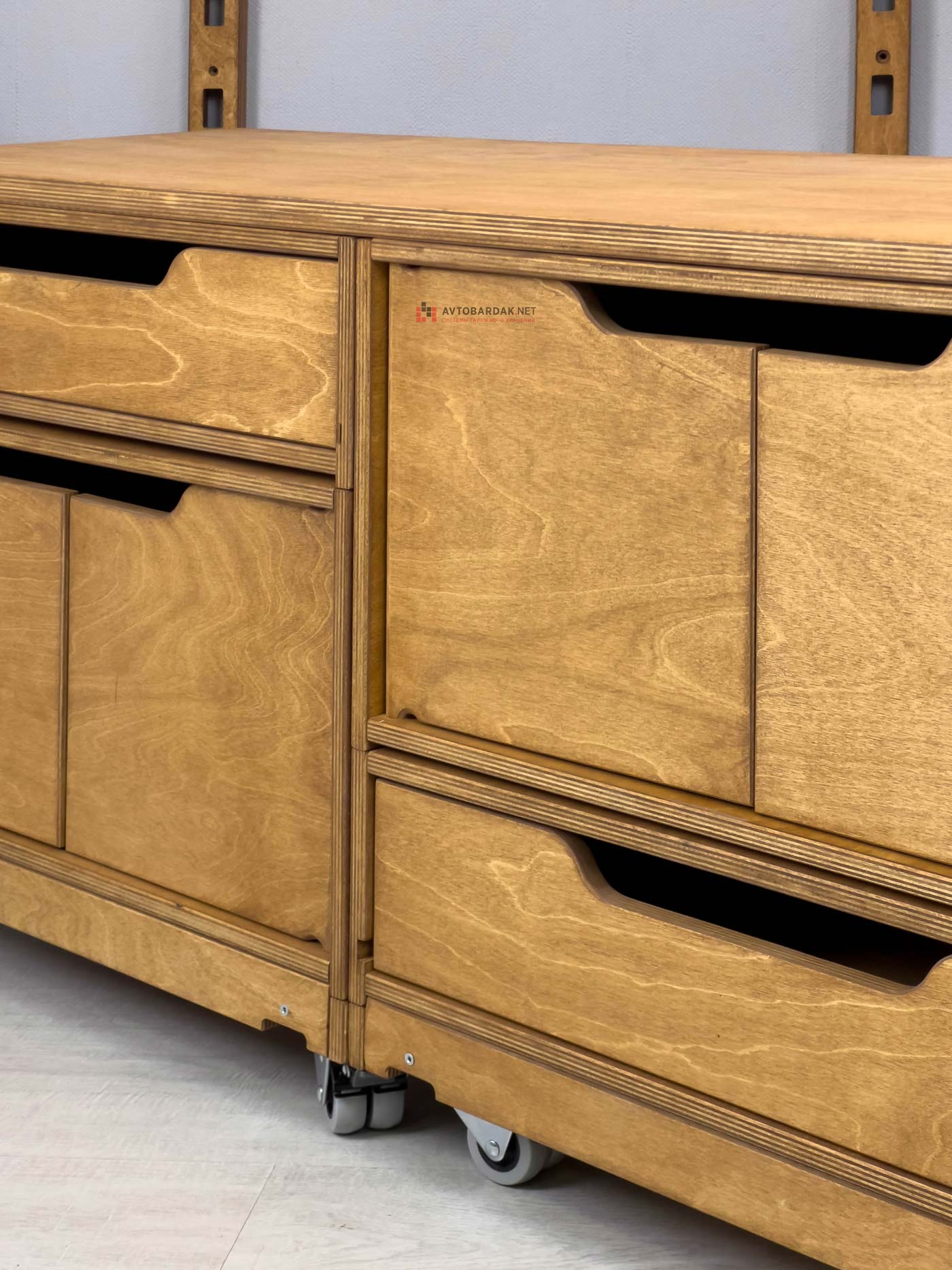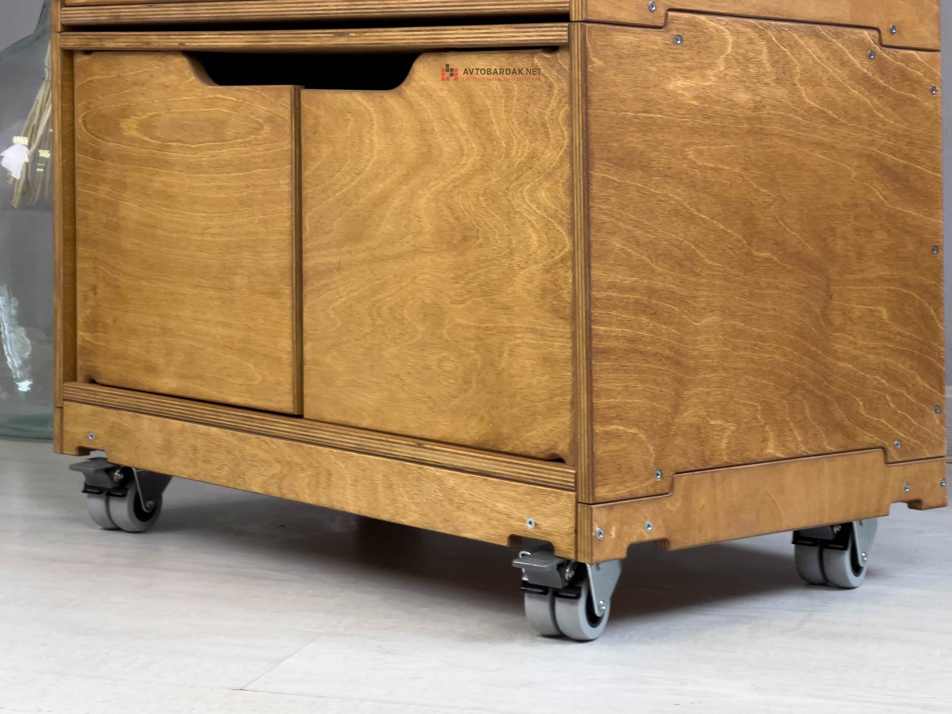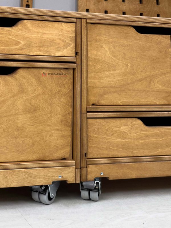 Низ модульной тумбы комплектуется подкатной тележкой на 4 колесиках (два с тормозом, два без тормоза). Тележка фиксируется с ящиками по такому же принципу. На тележке выступы, на ящиках пазы. При необходимости деревянную тележку скрепляем с нижним ящиком болтами.