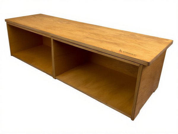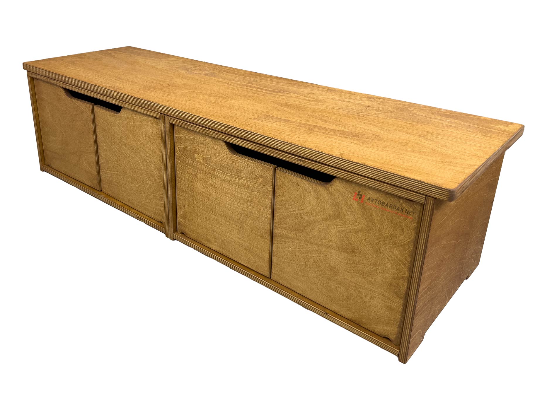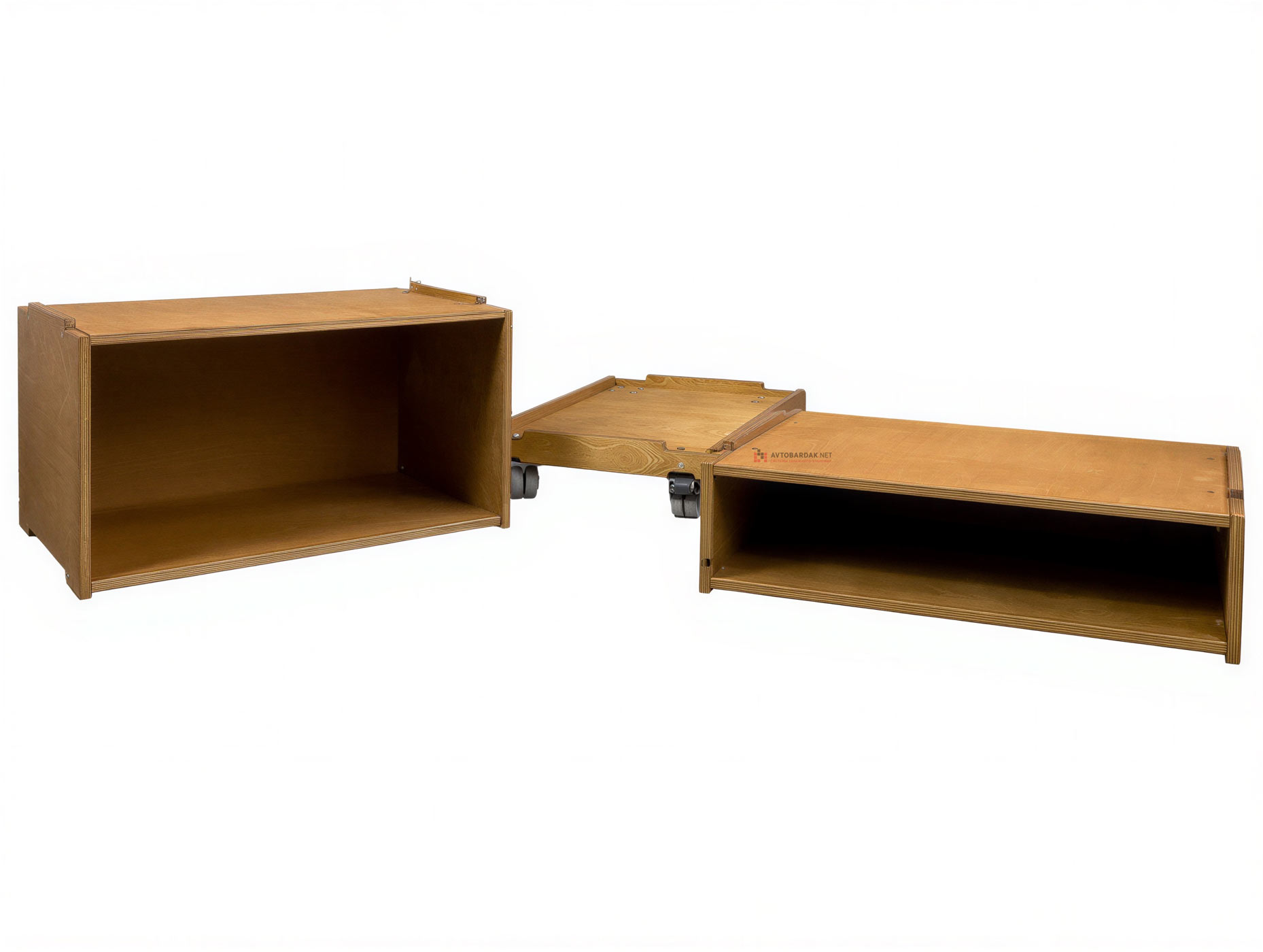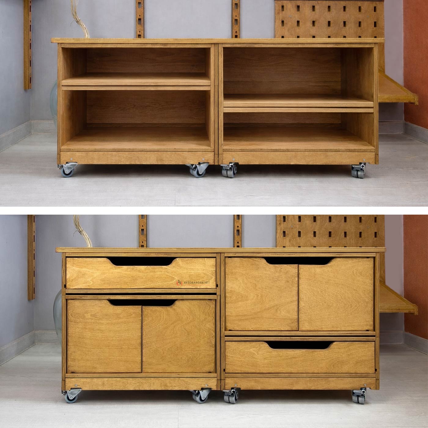 Низ модульной тумбы комплектуется подкатной тележкой на 4 колесиках (два с тормозом, два без тормоза). Тележка фиксируется с ящиками по такому же принципу. На тележке выступы, на ящиках пазы. При необходимости деревянную тележку скрепляем с нижним ящиком болтами.
