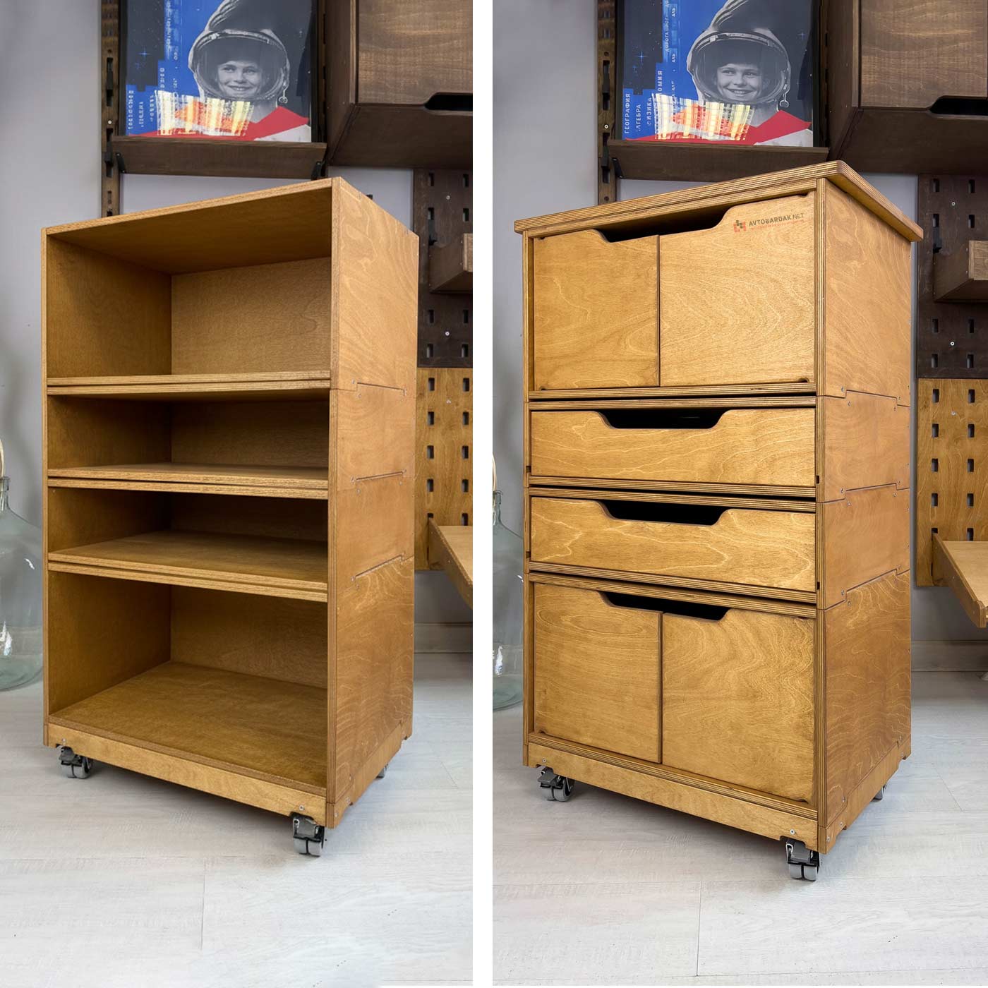 Подробное описание ящиков и модулей (материалы, нагрузка, размеры, вес, габариты и тд) в товарных карточках в каталоге "Модульные деревянные тележки и тумбы".