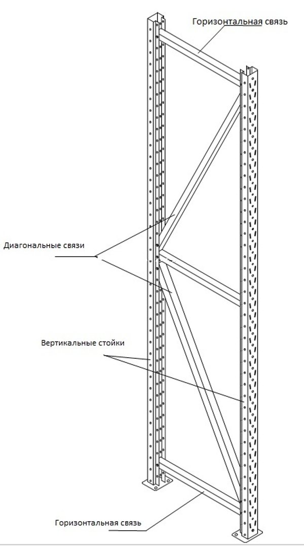 1. Сначала собираем Раму (боковую секцию стеллажа). Рама состоит из вертикальных стоек, горизонтальных и диагональных связей.