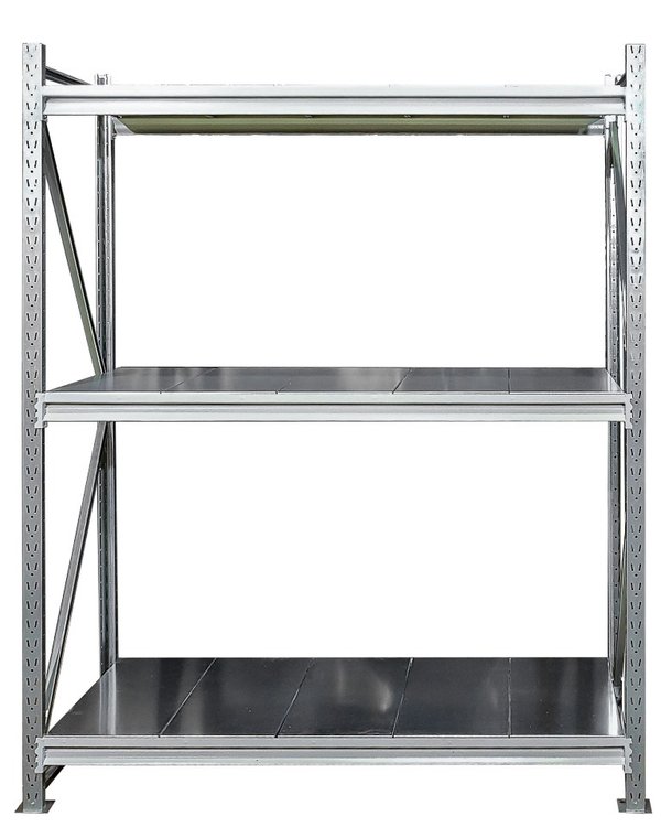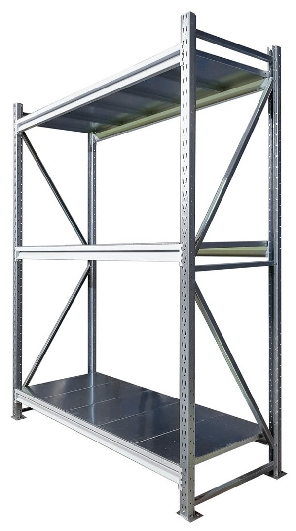 Рама стеллажа – оцинкованная сталь. Горизонтальные балки (на которых лежат полки) сталь, порошковая покраска, цвет серый. Полки на выбор: оцинкованная сталь или сталь с порошковой покраской в серый цвет.