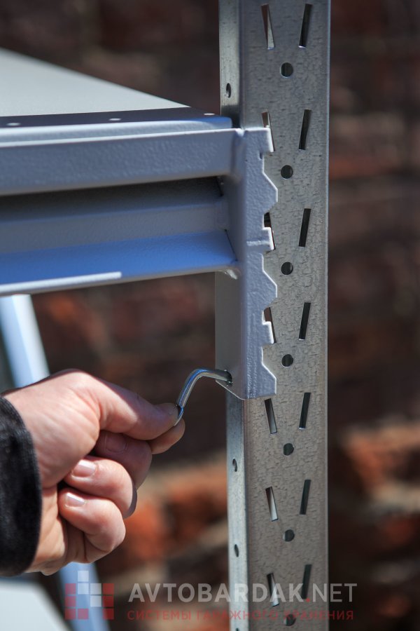 4. Установка полок. Каждый ряд стеллажа состоит из нескольких наборных полок по 300 мм. Полки съемные. Варианты длины основных секций: 1030 мм (3 полки в ряду), 1330 мм (4 полки в ряду) и 1630 мм (5 полок в ряду). Варианты длины секций продления: 965 мм (3 полки в ряду), 1265 мм (4 полки в ряду) и 1565 мм (5 полок в ряду). Подробнее про длину секции в описании товара.