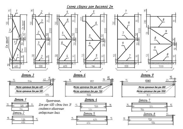 1. Сначала собираем Раму (боковую секцию стеллажа). Рама состоит из вертикальных стоек, горизонтальных и диагональных связей.
