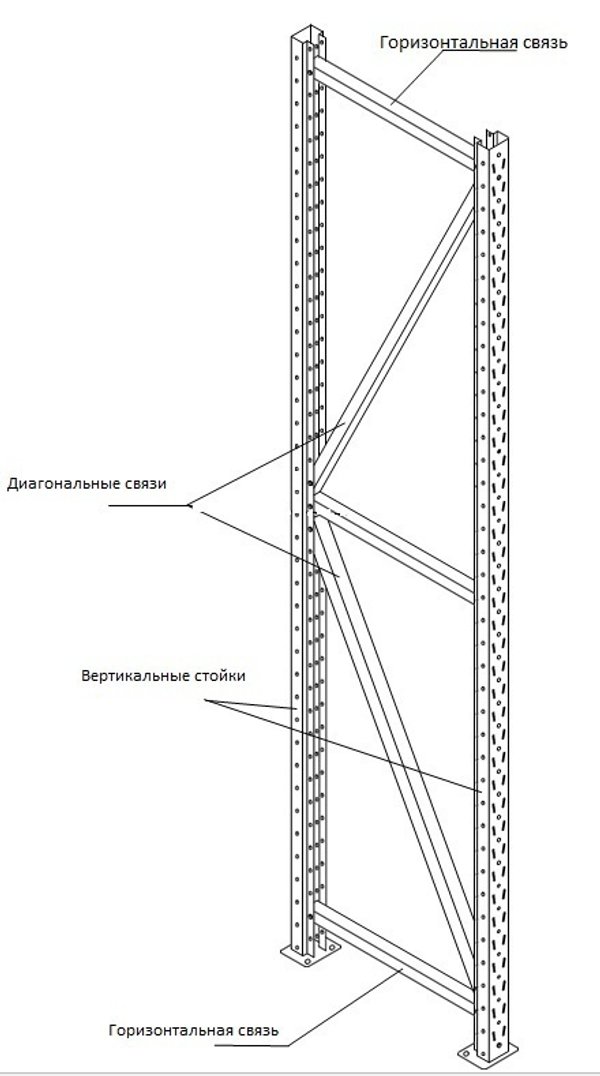 1. Сначала собираем Раму (боковую секцию стеллажа). Рама состоит из вертикальных стоек, горизонтальных и диагональных связей.