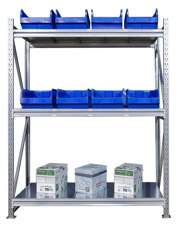 Рама стеллажа – оцинкованная сталь. Горизонтальные балки (на которых лежат полки) сталь, порошковая покраска, цвет серый. Полки на выбор: оцинкованная сталь или сталь с порошковой покраской в серый цвет.