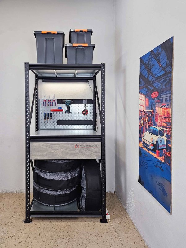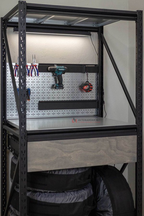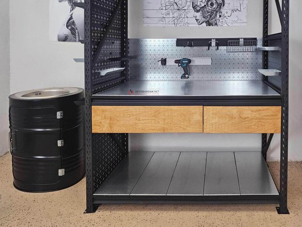 Верстак, интегрирован в модульную систему сборных напольных стеллажей.