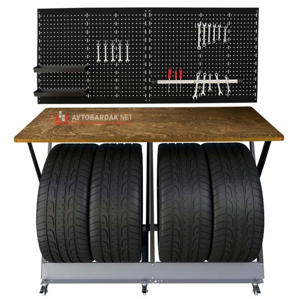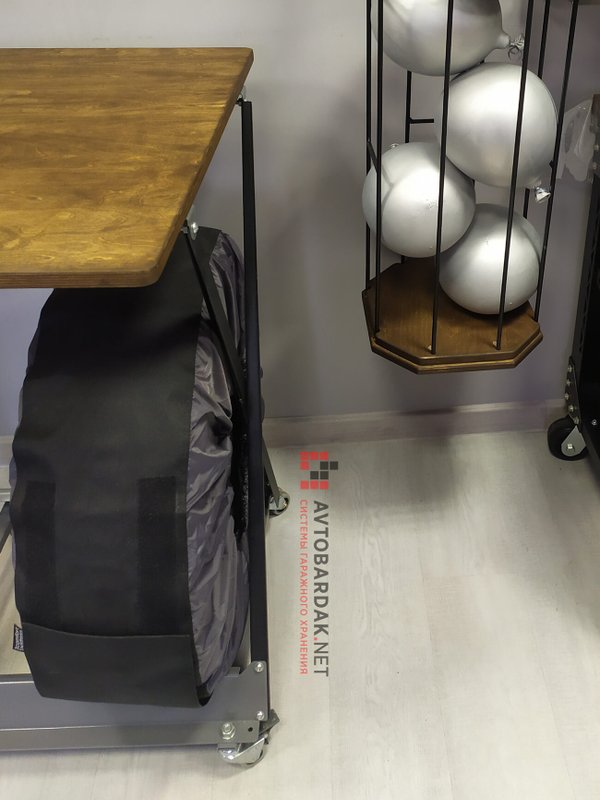 Стеллаж для хранения комплекта колес с деревянной столешницей.