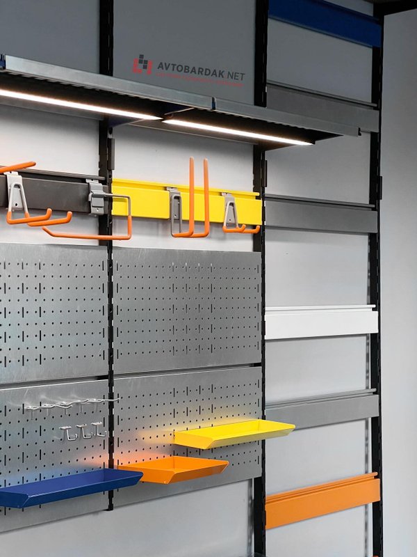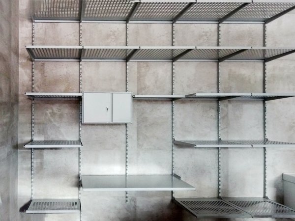Вертикальные направляющие (вместе с горизонтальными рейками) создают настенную раму, на которую подвешиваем полки и другие элементы системы хранения IF. Все элементы зацепляются за перфорацию вертикальной направляющей, их можно снимать и переставлять по всей длине вертикальной направляющей с шагом 50 мм.