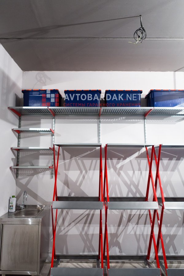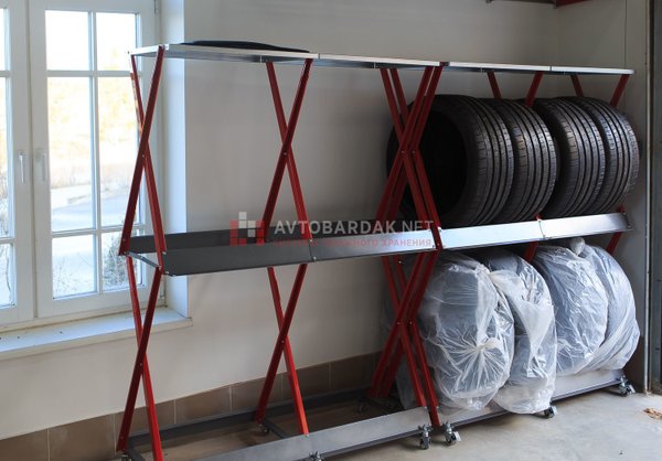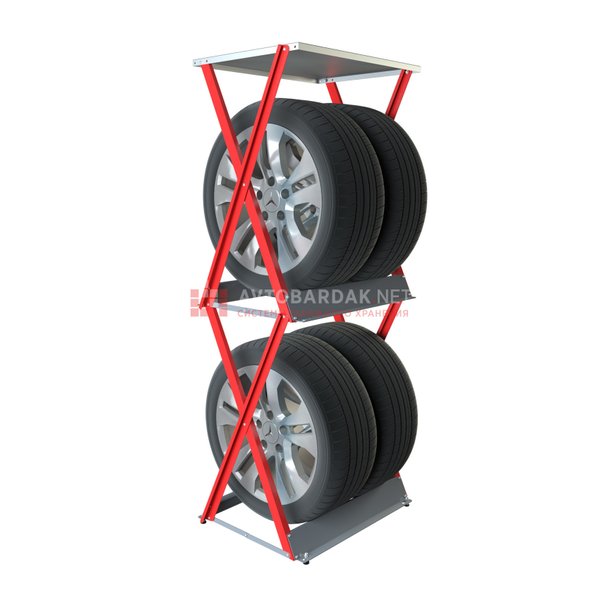 Вертикальная стойка для хранения комплекта шин состоит из двух секций, вмещающих 2 колеса. Один модуль располагается над другим.